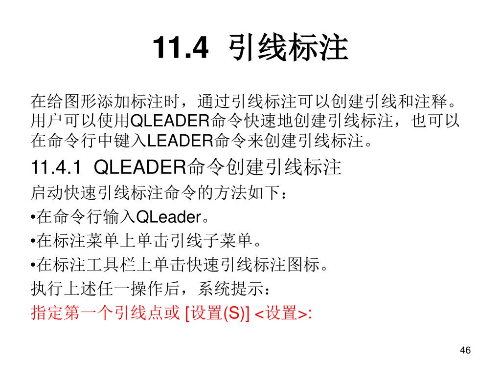 11.4 引线标注 在给图形添加标注时,通过引线标注可以创建引线和注释。用户可以使用QLEADER命令快速地创建引线标注,也可以在命令行中键入LEADER命令来创建引线标注。 11.4.1 QLEADER命令创建引线标注 启动快速引线标注命令的方法如下: • 在命令行输入QLeader。 • 在标注菜单上单击引线子菜单。 • 在标注工具栏上单击快速引线标注图标。 执行上述任一操作后,系统提示: 指定第一个引线点或 [设置(S)] <设置>: