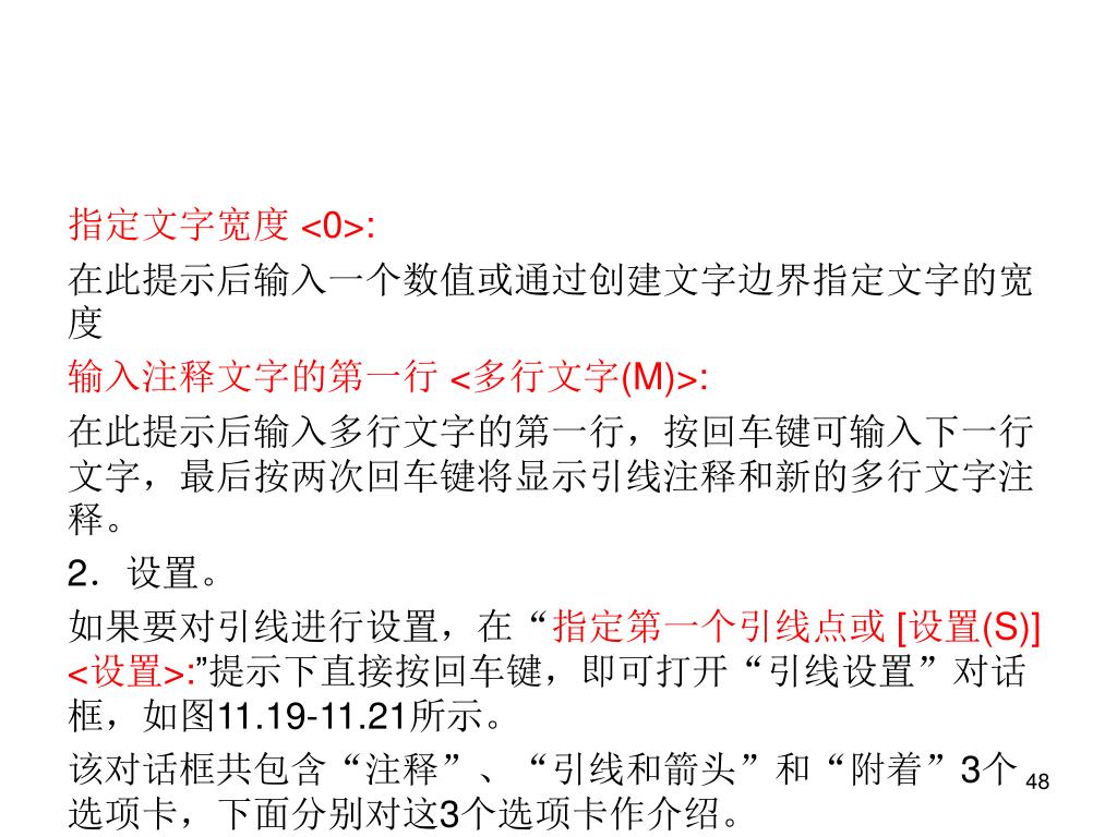 指定文字宽度 <0>: 在此提示后输入一个数值或通过创建文字边界指定文字的宽度 输入注释文字的第一行 <多行文字(M)>: 在此提示后输入多行文字的第一行,按回车键可输入下一行文字,最后按两次回车键将显示引线注释和新的多行文字注释。 2.设置。 如果要对引线进行设置,在“指定第一个引线点或 [设置(S)] <设置>:”提示下直接按回车键,即可打开“引线设置”对话框,如图11.19-11.21所示。 该对话框共包含“注释”、“引线和箭头”和“附着”3个选项卡,下面分别对这3个选项卡作介绍。