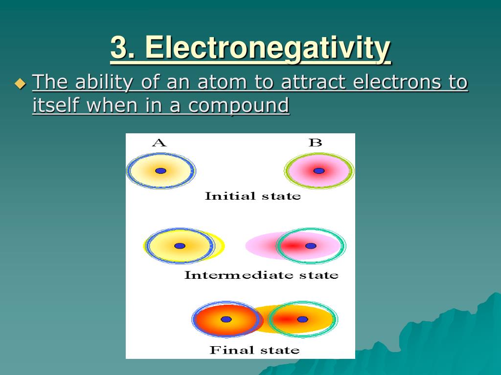 3. Electronegativity • The ability of an atom to attract electrons to itself when in a compound