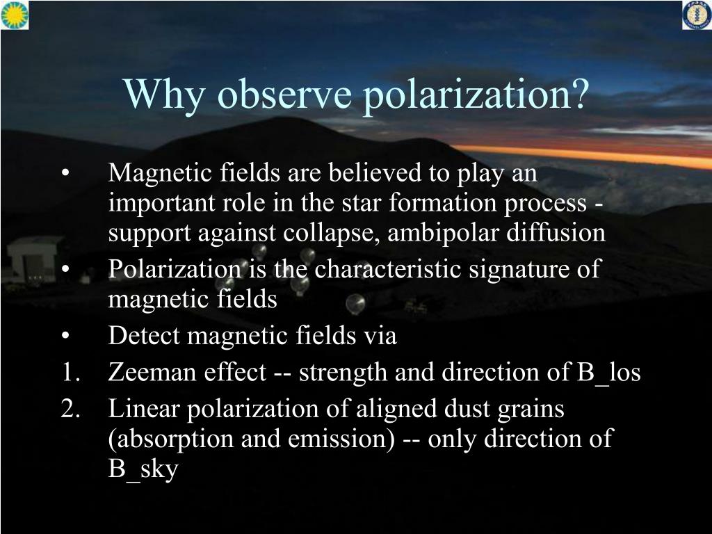 Why observe polarization? • Magnetic fields are believed to play an important role in the star formation process - support against collapse, ambipolar diffusion • Polarization is the characteristic signature of magnetic fields • Detect magnetic fields via • Zeeman effect -- strength and direction of B_los • Linear polarization of aligned dust grains (absorption and emission) -- only direction of B_sky