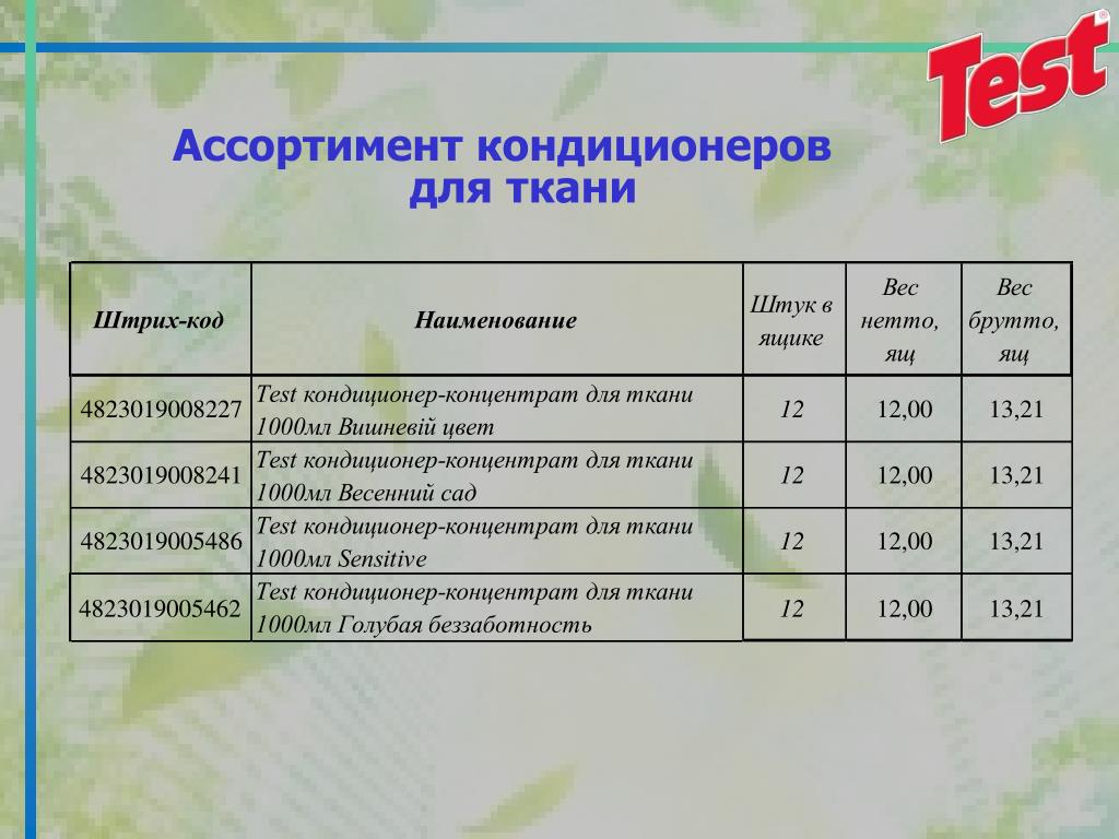 ПРЕЗЕНТАЦИЯ. 201 2. Стиральные порошки Жидкости для мытья посуды Чистящие средства Вспомогательн ы е средства для стирки и уборки. Товары тм Test. Позиционирование. Ценовой сегмент средний ЦА Женщины 25-55 Конкуренты : - стиральный порошок - Sarma, Losk жидкость для посуды – Gala