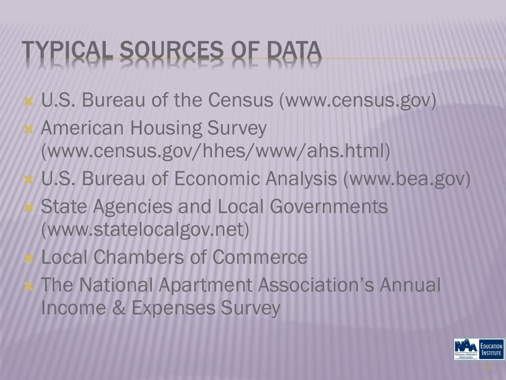 U.S. Bureau of the Census (www.census.gov) • American Housing Survey (www.census.gov/hhes/www/ahs.html) • U.S. Bureau of Economic Analysis (www.bea.gov) • State Agencies and Local Governments (www.statelocalgov.net) • Local Chambers of Commerce • The National Apartment Association’s Annual Income & Expenses Survey Typical Sources of Data