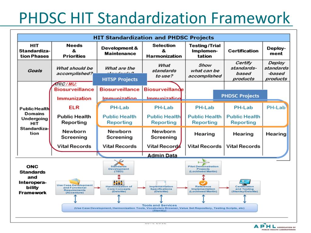 Benefits of Collaboration PHDSC 2012 • Expertise on both sides is combined • PHDSC: • Advocacy • Policy development activities (HITSP) • Standards development • CDA • Implementation testing • APHL: • Advocacy and informatics policy • Standards development • Lab domain expertise • HL7 message implementation guide development and deployment • Hands on Technical Assistance program for data exchange implementations