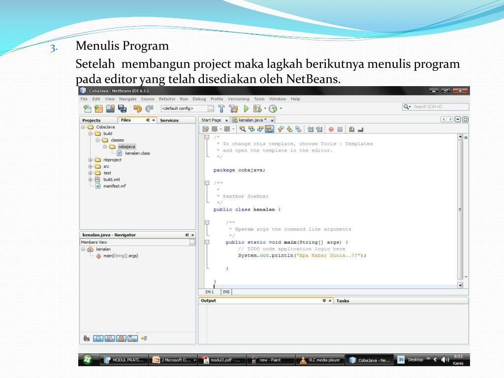 Menulis Program Setelah membangun project maka lagkah berikutnya menulis program pada editor yang telah disediakan oleh NetBeans.
