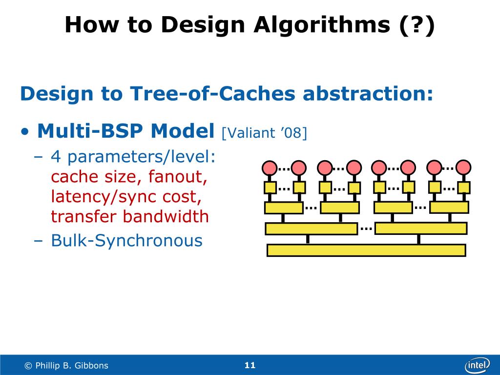 … … … … … … … … … … … How to Design Algorithms (?) Design to Tree-of-Caches abstraction: • Multi-BSP Model[Valiant ’08] • 4 parameters/level:cache size, fanout,latency/sync cost, transfer bandwidth • Bulk-Synchronous