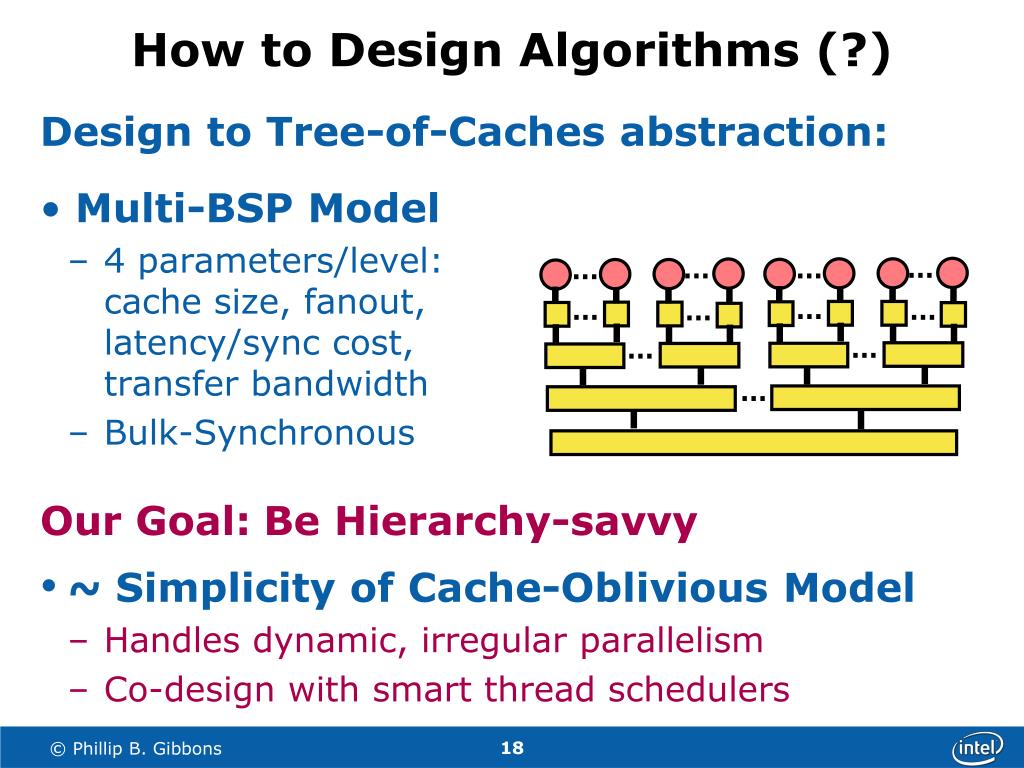 … … … … … … … … … … … How to Design Algorithms (?) Design to Tree-of-Caches abstraction: • Multi-BSP Model • 4 parameters/level:cache size, fanout,latency/sync cost, transfer bandwidth • Bulk-Synchronous Our Goal:Be Hierarchy-savvy • ~ Simplicity of Cache-Oblivious Model • Handles dynamic, irregular parallelism • Co-design with smart thread schedulers