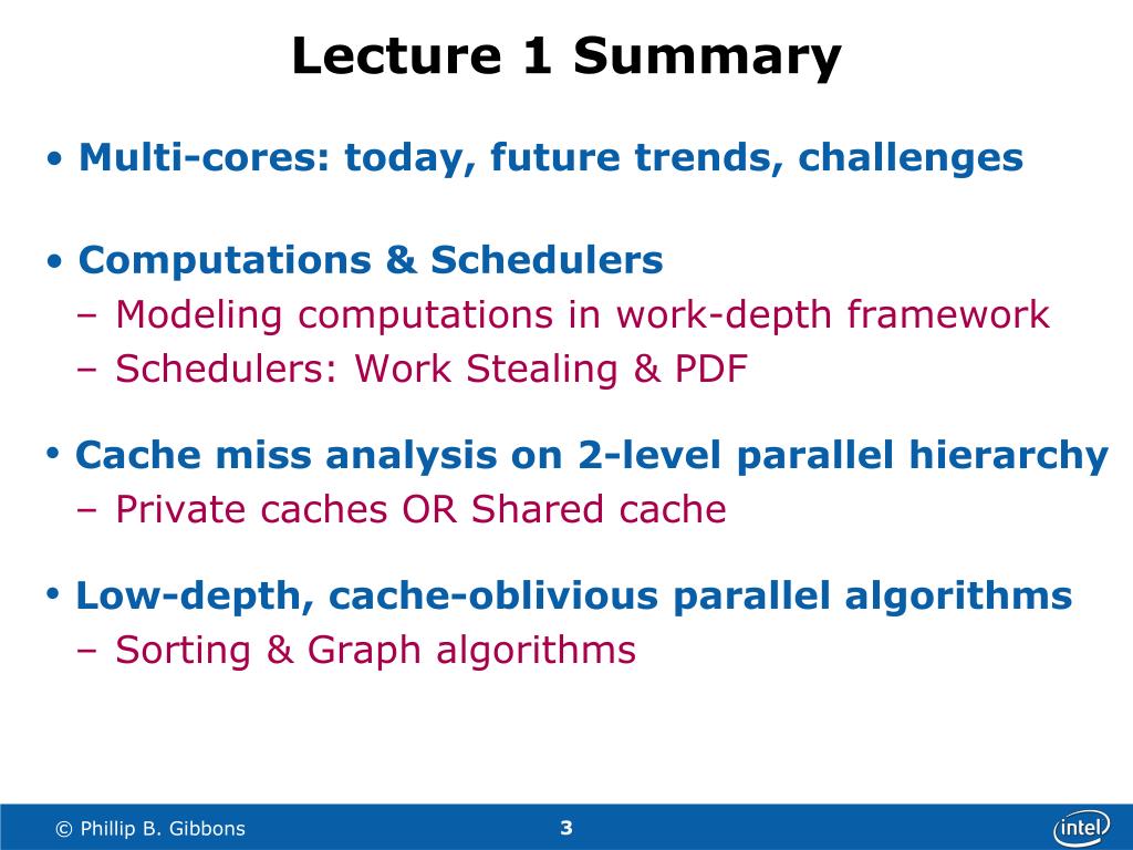 Lecture 1 Summary • Multi-cores: today, future trends, challenges • Computations & Schedulers • Modeling computations in work-depth framework • Schedulers: Work Stealing & PDF • Cache miss analysis on 2-level parallel hierarchy • Private caches OR Shared cache • Low-depth, cache-oblivious parallel algorithms • Sorting & Graph algorithms