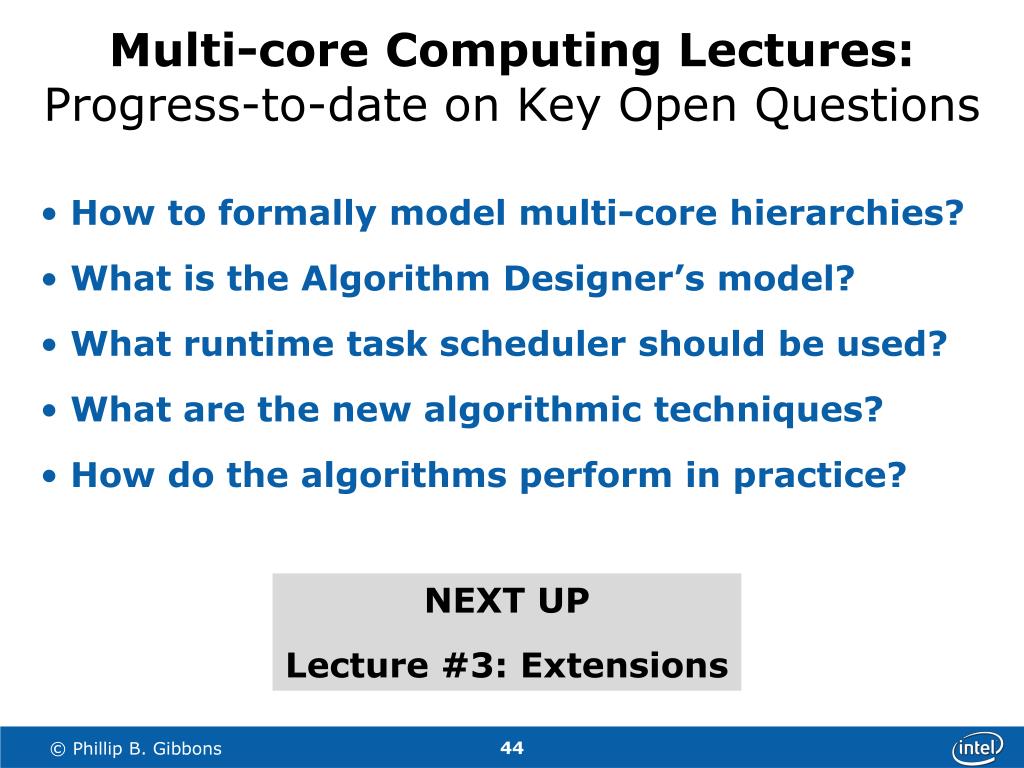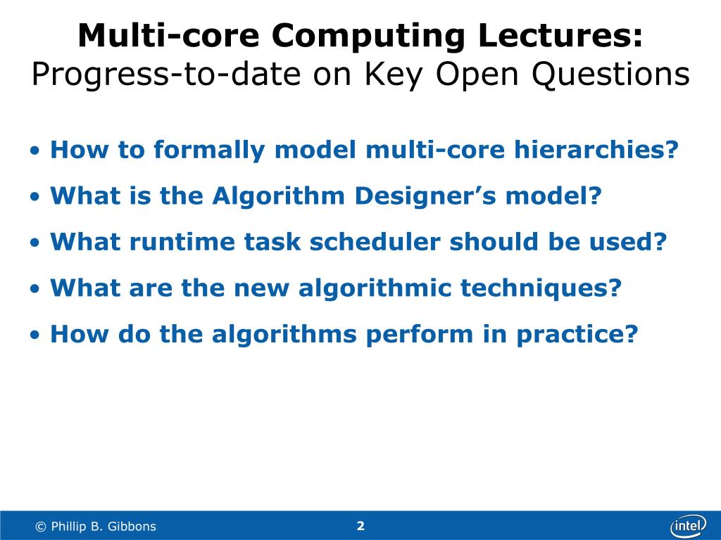 Multi-core Computing Lecture 2 MADALGO Summer School 2012 Algorithms for Modern Parallel and Distributed Models . Phillip B. Gibbons Intel Labs Pittsburgh August 21, 2012. Multi-core Computing Lectures: Progress-to-date on Key Open Questions. How to formally model multi-core hierarchies?