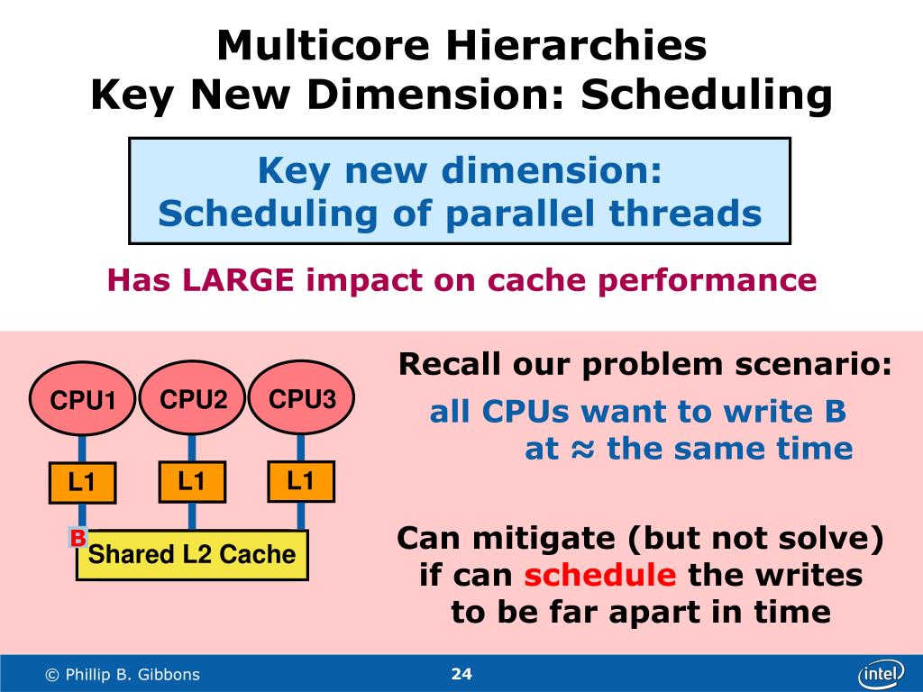 CPU2 CPU1 CPU3 L1 L1 L1 Key new dimension: Scheduling of parallel threads B Shared L2 Cache L2 Cache Multicore HierarchiesKey New Dimension: Scheduling Has LARGE impact on cache performance Recall our problem scenario: all CPUs want to write B at ≈ the same time Key reason: Caches not fully shared Can mitigate (but not solve) if can schedule the writesto be far apart in time