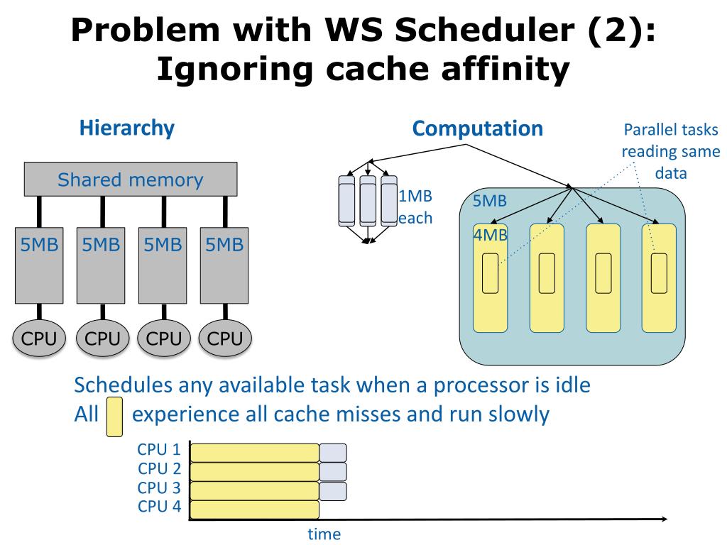 Problem with WS Scheduler (2):Ignoring cache affinity Hierarchy Computation Parallel tasks reading same data Shared memory 1MB each 5MB 4MB 5MB 5MB 5MB 5MB CPU CPU CPU CPU Schedules any available task when a processor is idle All experience all cache misses and run slowly CPU 1 CPU 2 CPU 3 CPU 4 time