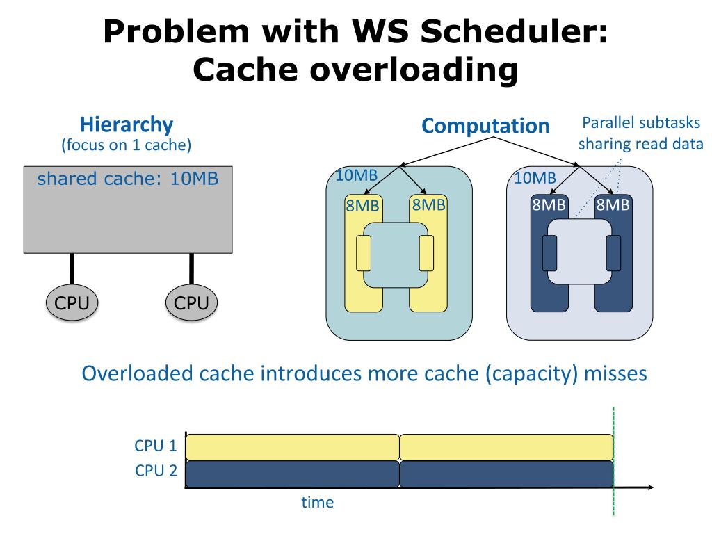 Problem with WS Scheduler:Cache overloading Computation Parallel subtasks sharing read data Hierarchy (focus on 1 cache) 10MB 10MB shared cache: 10MB 8MB 8MB 8MB 8MB CPU CPU Overloaded cache introduces more cache (capacity) misses CPU 1 CPU 2 time