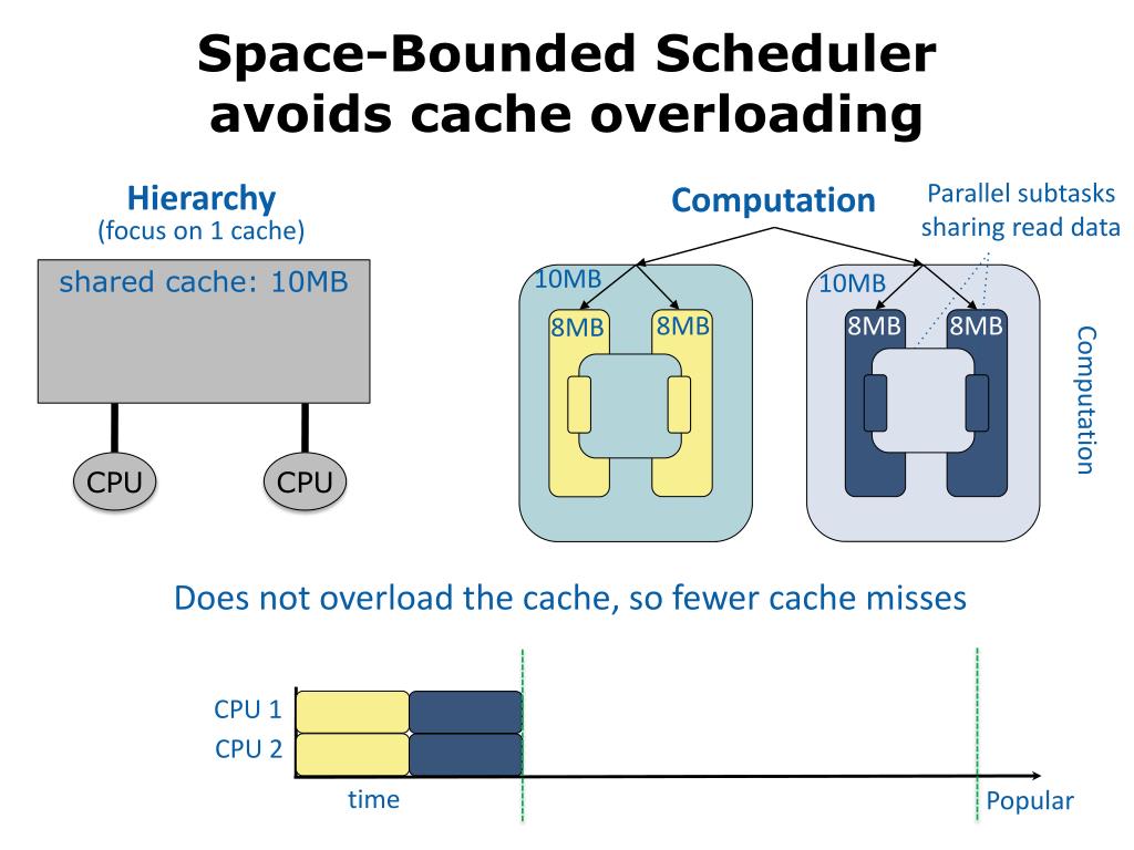 Space-Bounded Scheduleravoids cache overloading Parallel subtasks sharing read data Computation Hierarchy (focus on 1 cache) 10MB shared cache: 10MB 10MB 8MB 8MB 8MB 8MB Computation CPU CPU Does not overload the cache, so fewer cache misses CPU 1 CPU 2 time Popular
