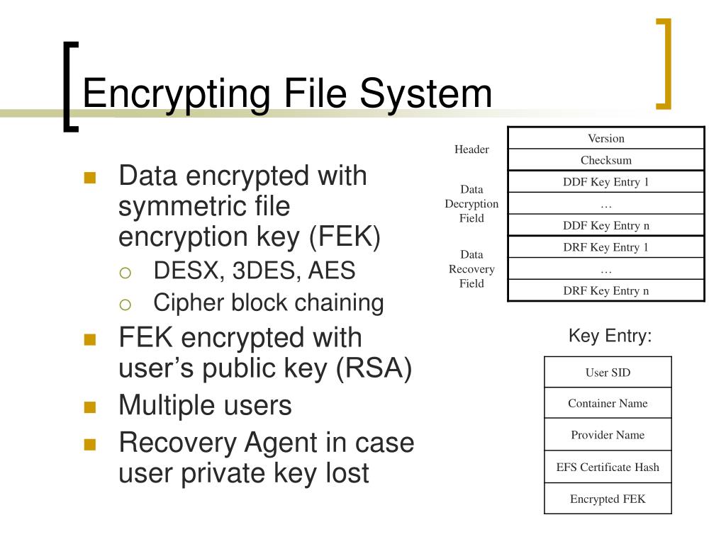 File System and Full Volume Encryption. Sachin Patel CSE 590TU 3/9/2006. Encrypting File System. Protects sensitive data on computers and laptops from physical theft. Encryption at a lower level that all applications can use. EFS introduced in Windows 2000 Tied to the NTFS file system