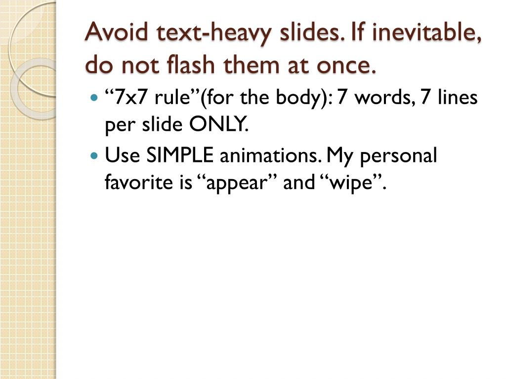 Avoid text-heavy slides. If inevitable, do not flash them at once. • “7x7 rule”(for the body): 7 words, 7 lines per slide ONLY. • Use SIMPLE animations. My personal favorite is “appear” and “wipe”.