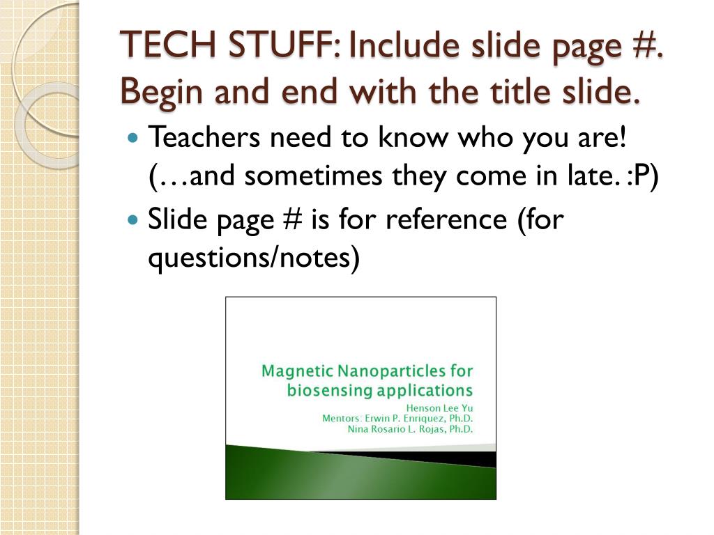 TECH STUFF: Include slide page #. Begin and end with the title slide. • Teachers need to know who you are! (…and sometimes they come in late. :P) • Slide page # is for reference (for questions/notes)