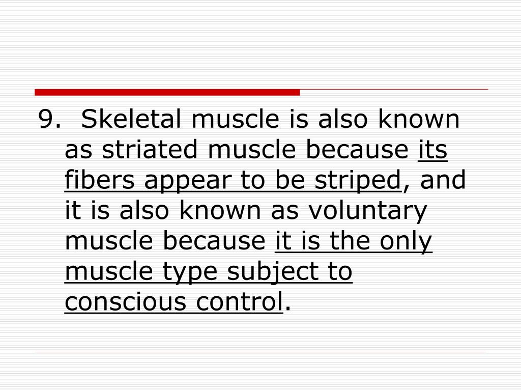 9. Skeletal muscle is also known as striated muscle because its fibers appear to be striped, and it is also known as voluntary muscle because it is the only muscle type subject to conscious control.