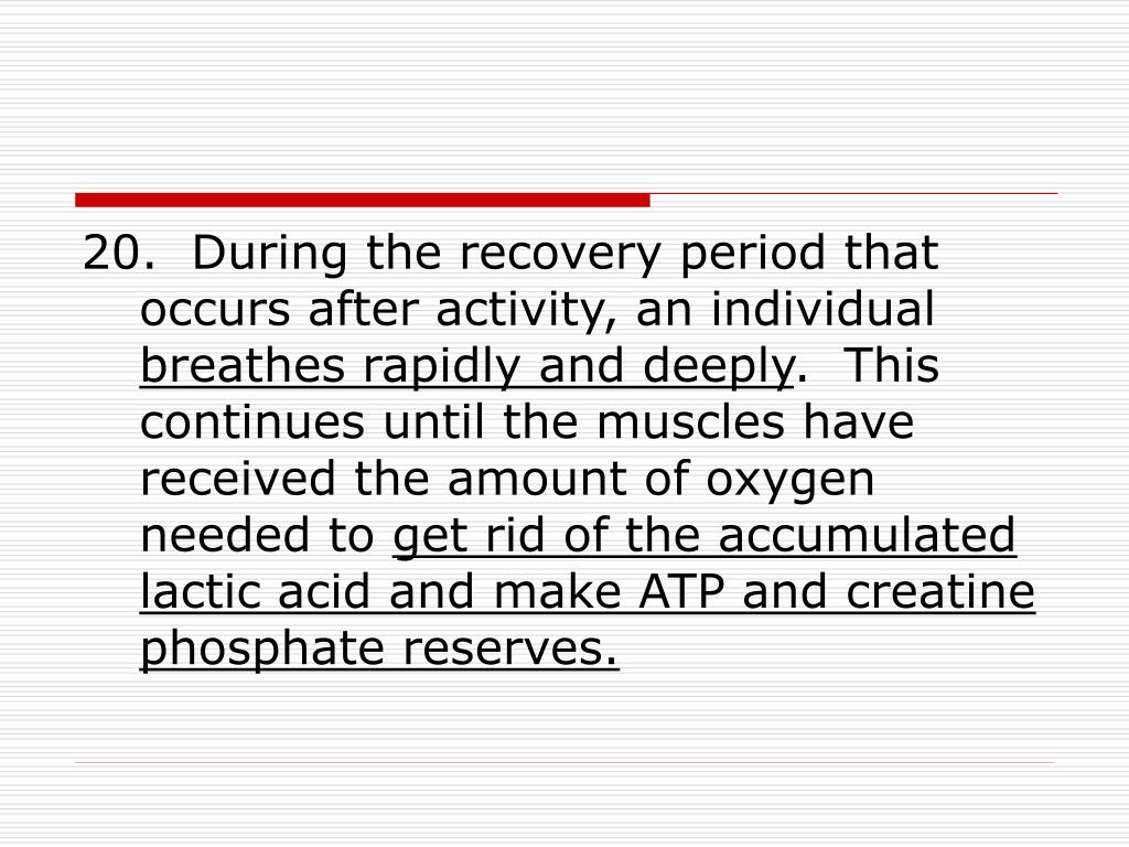 20. During the recovery period that occurs after activity, an individual breathes rapidly and deeply. This continues until the muscles have received the amount of oxygen needed to get rid of the accumulated lactic acid and make ATP and creatine phosphate reserves.