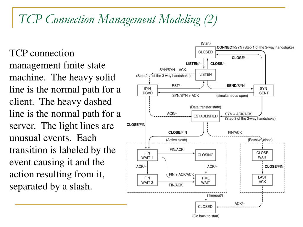 TCP Connection Management Modeling (2) TCP connection management finite state machine. The heavy solid line is the normal path for a client. The heavy dashed line is the normal path for a server. The light lines are unusual events. Each transition is labeled by the event causing it and the action resulting from it, separated by a slash.