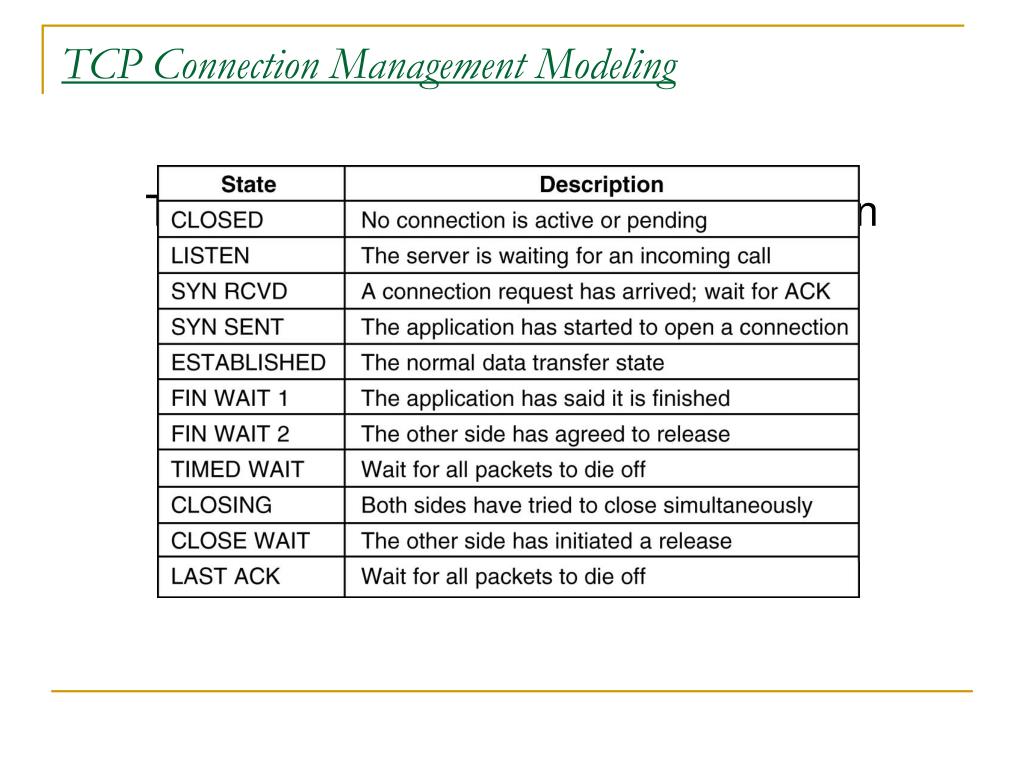 TCP Connection Management Modeling The states used in the TCP connection management finite state machine.