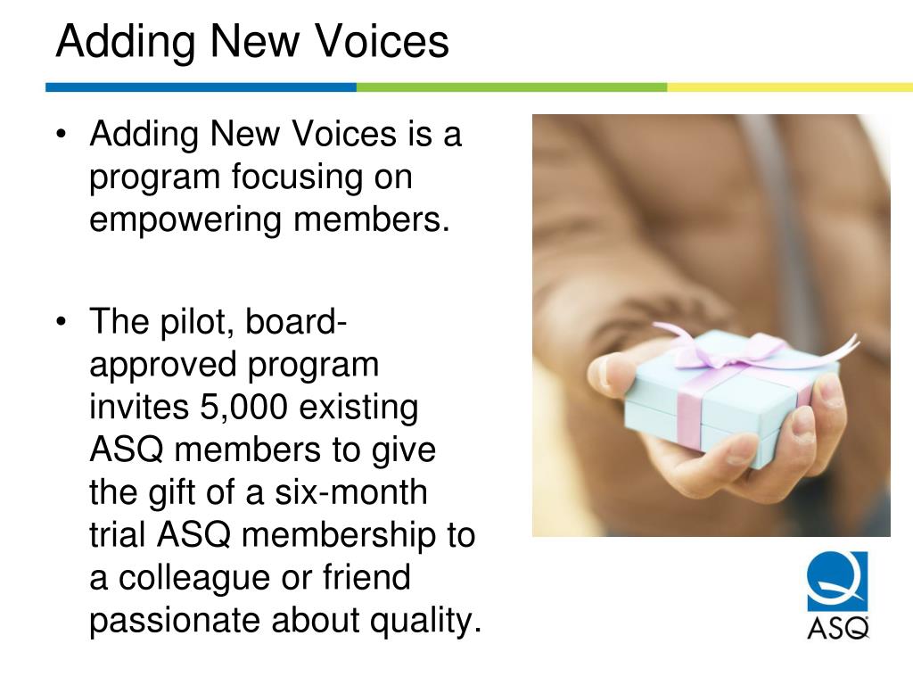 Adding New Voices • Adding New Voices is a program focusing on empowering members. • The pilot, board-approved program invites 5,000 existing ASQ members to give the gift of a six-month trial ASQ membership to a colleague or friend passionate about quality.