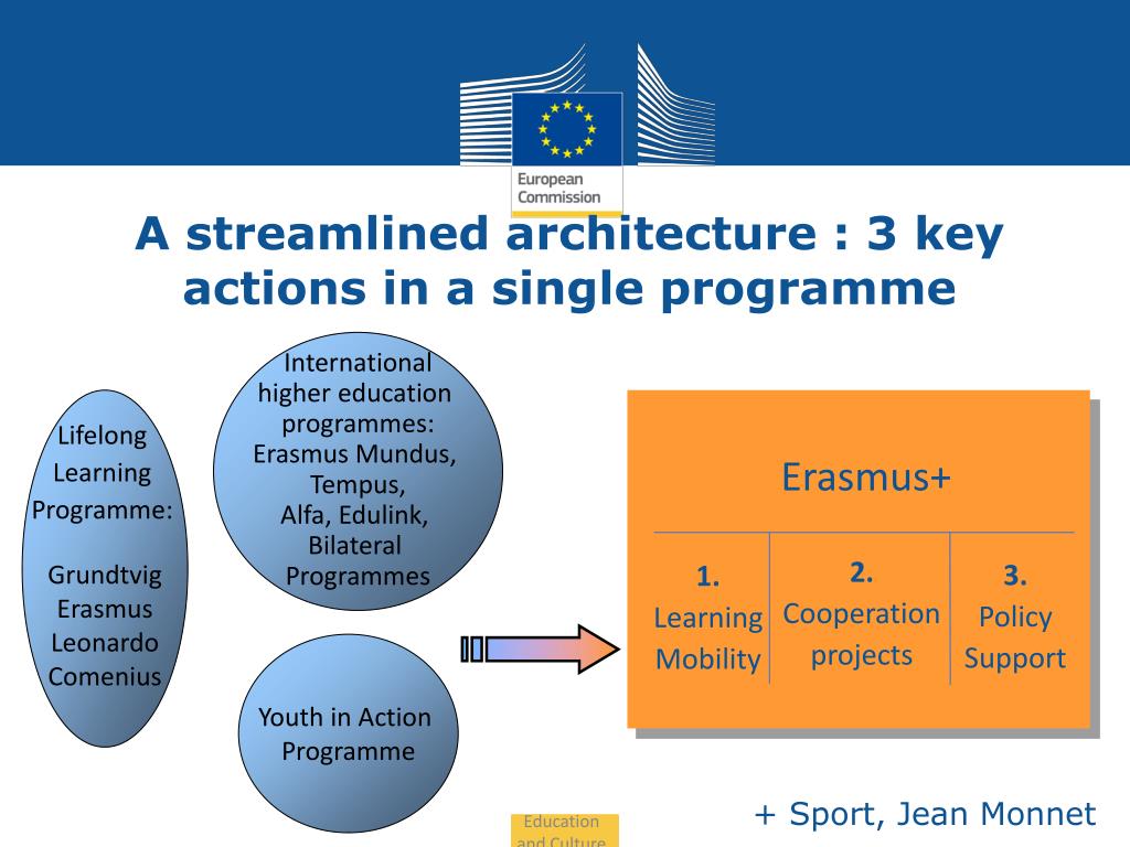Erasmus+ 2. Cooperation projects 3. Policy Support 1. Learning Mobility + Sport, Jean Monnet A streamlined architecture : 3 key actions in a single programme International higher education programmes: Erasmus Mundus, Tempus, Alfa, Edulink, Bilateral Programmes Grundtvig Erasmus Leonardo Comenius Lifelong Learning Programme: Youth in Action Programme Education and Culture