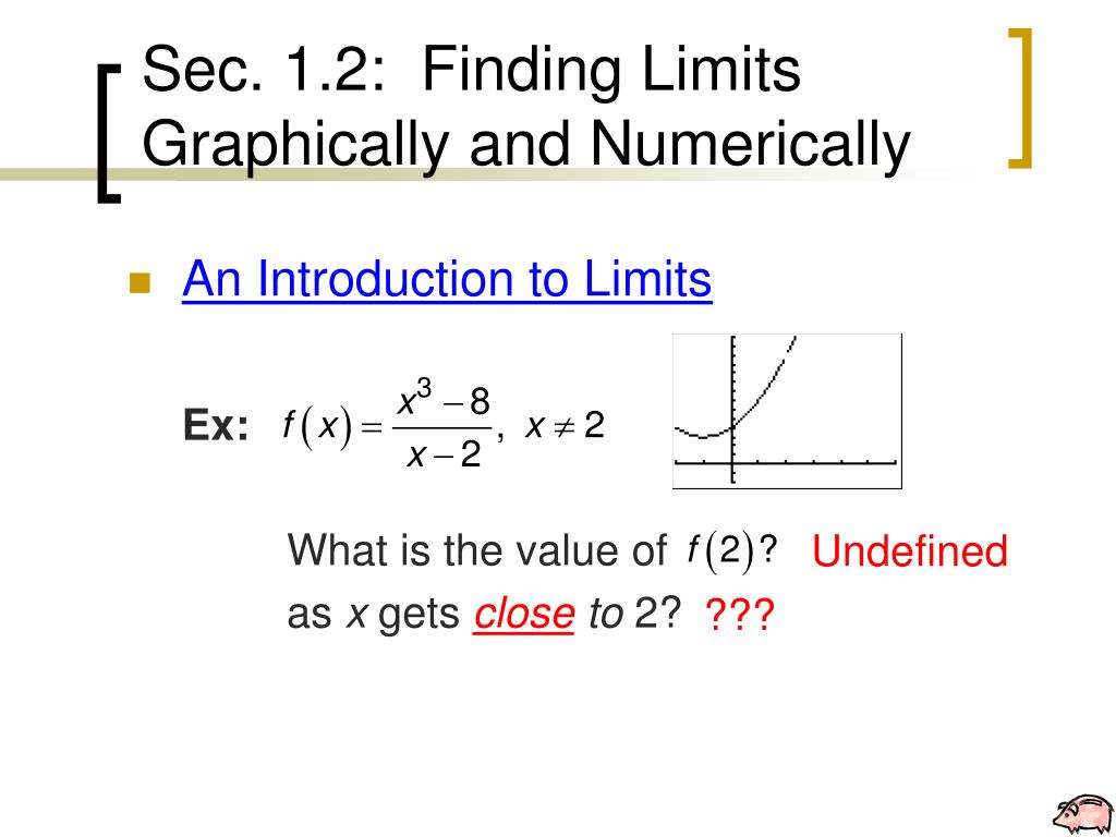 Sec. 1.2: Finding Limits Graphically and Numerically • An Introduction to Limits Ex: What is the value of as x gets close to 2? Undefined ???
