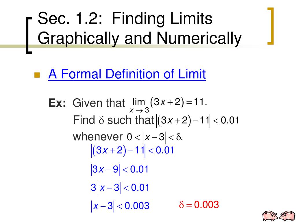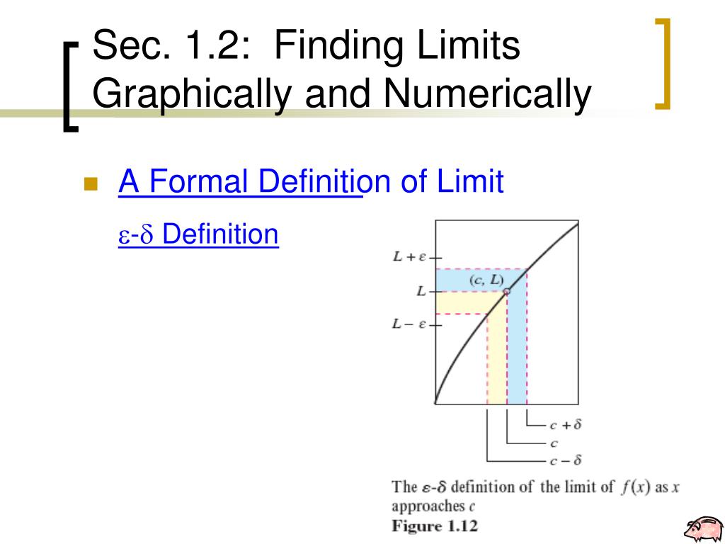 Sec. 1.2: Finding Limits Graphically and Numerically • A Formal Definition of Limit - Definition Let f be a function defined on an open interval containing c (except possibly at c) and let L be a . The statement means that for each > 0, a > 0 if “There exists” Epsilon Delta A real number “Such That”