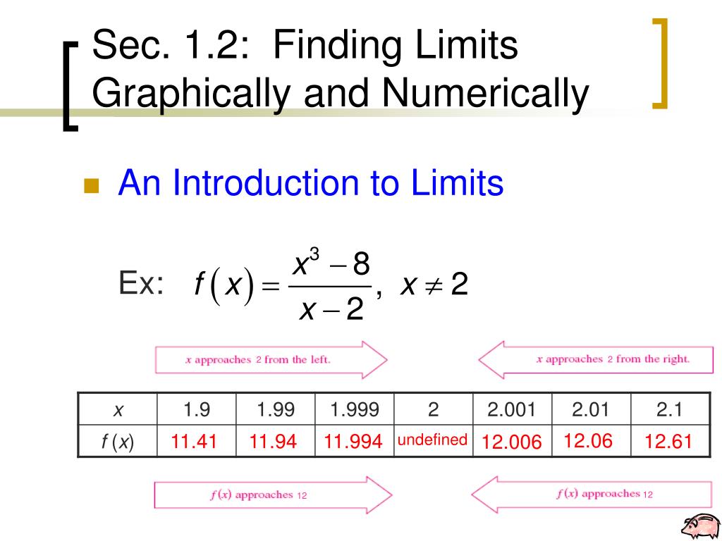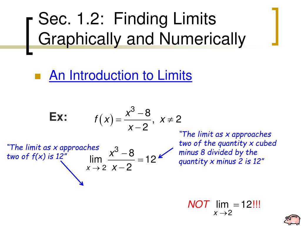 Sec. 1.2: Finding Limits Graphically and Numerically • An Introduction to Limits Ex: “The limit as x approaches two of the quantity x cubed minus 8 divided by the quantity x minus 2 is 12” “The limit as x approaches two of f(x) is 12”