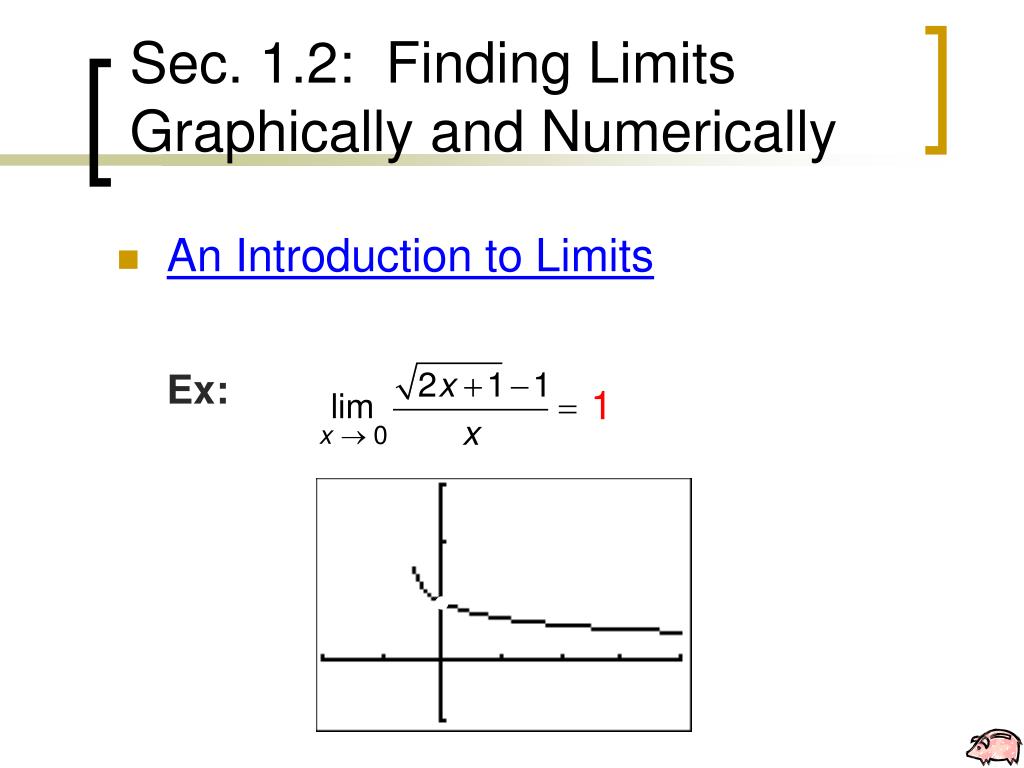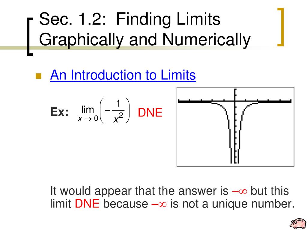 Sec. 1.2: Finding Limits Graphically and Numerically • An Introduction to Limits Ex: It would appear that the answer is –but this limit DNE because – is not a unique number. DNE