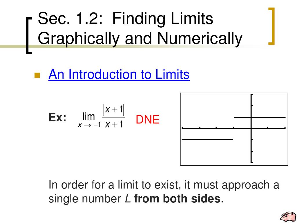 Sec. 1.2: Finding Limits Graphically and Numerically • An Introduction to Limits Ex: In order for a limit to exist, it must approach a single number Lfrom both sides. DNE