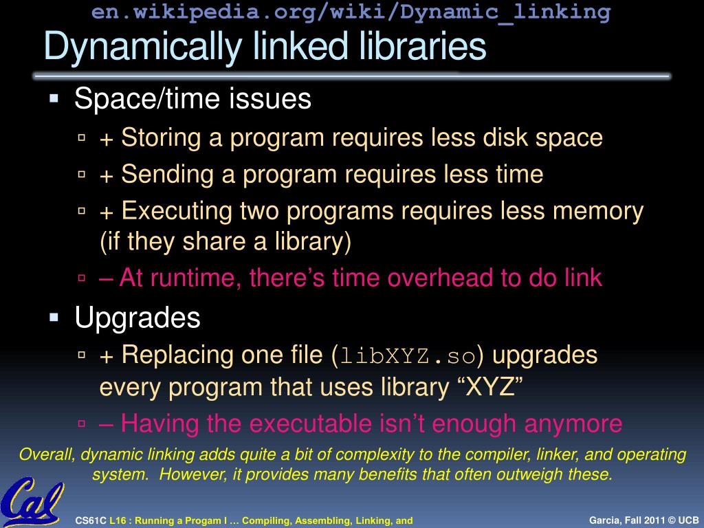 en.wikipedia.org/wiki/Dynamic_linking Dynamically linked libraries • Space/time issues • + Storing a program requires less disk space • + Sending a program requires less time • + Executing two programs requires less memory (if they share a library) • – At runtime, there’s time overhead to do link • Upgrades • + Replacing one file (libXYZ.so) upgrades every program that uses library “XYZ” • – Having the executable isn’t enough anymore Overall, dynamic linking adds quite a bit of complexity to the compiler, linker, and operating system. However, it provides many benefits that often outweigh these.