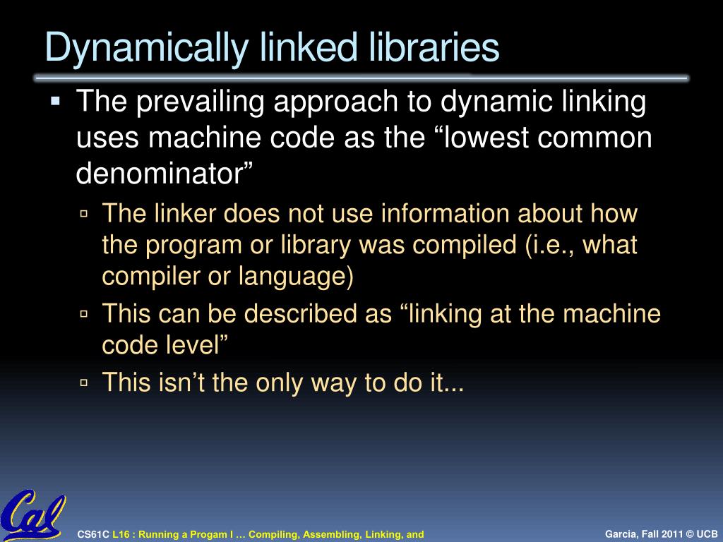 Dynamically linked libraries • The prevailing approach to dynamic linking uses machine code as the “lowest common denominator” • The linker does not use information about how the program or library was compiled (i.e., what compiler or language) • This can be described as “linking at the machine code level” • This isn’t the only way to do it...
