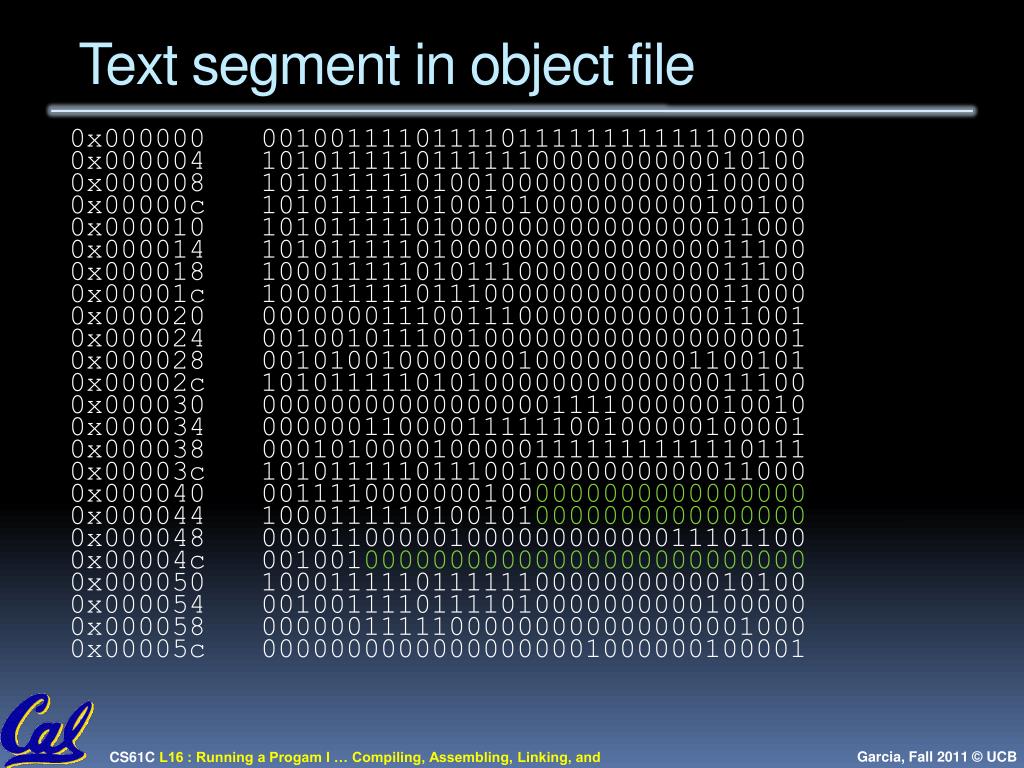 Text segment in object file 0x000000 00100111101111011111111111100000 0x000004 10101111101111110000000000010100 0x000008 10101111101001000000000000100000 0x00000c 10101111101001010000000000100100 0x000010 10101111101000000000000000011000 0x000014 10101111101000000000000000011100 0x000018 10001111101011100000000000011100 0x00001c 10001111101110000000000000011000 0x000020 00000001110011100000000000011001 0x000024 00100101110010000000000000000001 0x000028 00101001000000010000000001100101 0x00002c 10101111101010000000000000011100 0x000030 00000000000000000111100000010010 0x000034 00000011000011111100100000100001 0x000038 00010100001000001111111111110111 0x00003c 10101111101110010000000000011000 0x000040 00111100000001000000000000000000 0x000044 10001111101001010000000000000000 0x000048 00001100000100000000000011101100 0x00004c 00100100000000000000000000000000 0x000050 10001111101111110000000000010100 0x000054 00100111101111010000000000100000 0x000058 00000011111000000000000000001000 0x00005c 00000000000000000001000000100001
