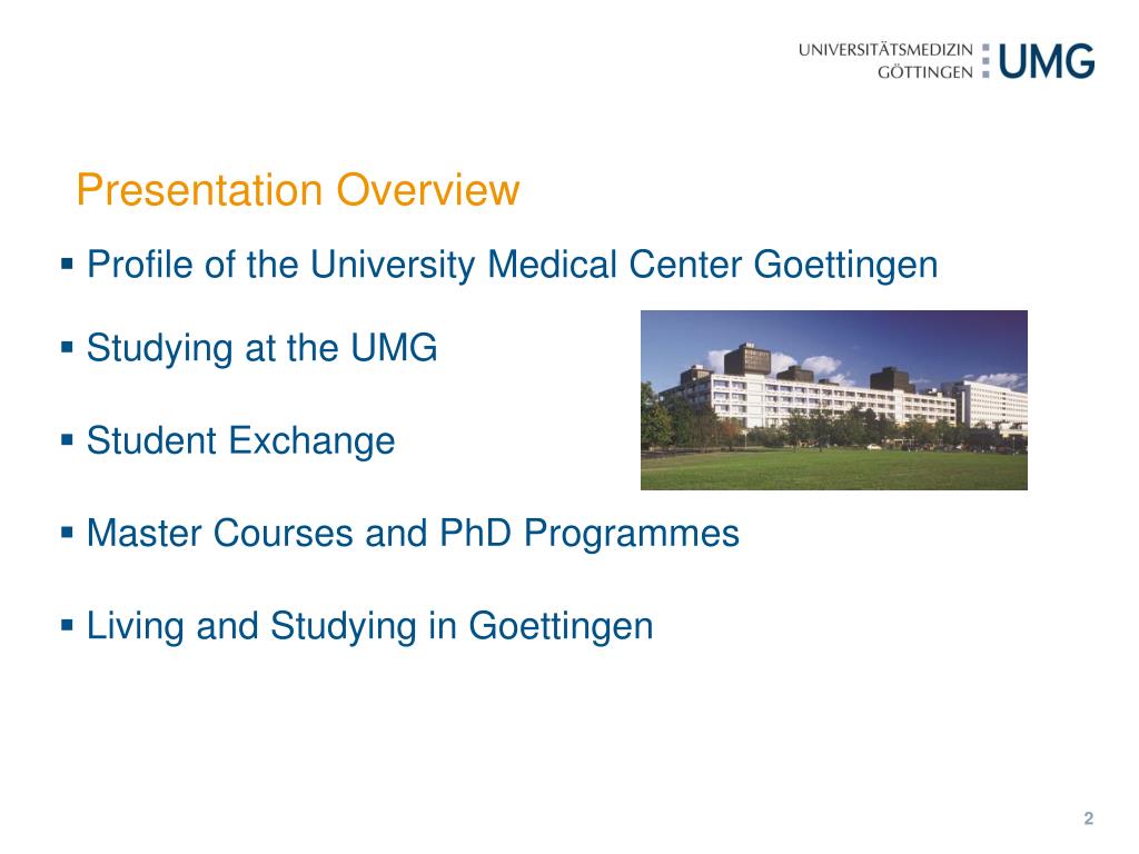 Presentation Overview • Profile of the University Medical Center Goettingen • Studying at the UMG • Student Exchange • Master Courses and PhD Programmes • Living and Studying in Goettingen