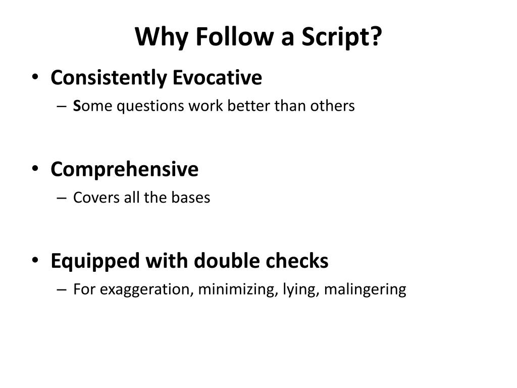 Why Follow a Script? • Consistently Evocative • Some questions work better than others • Comprehensive • Covers all the bases • Equipped with double checks • For exaggeration, minimizing, lying, malingering