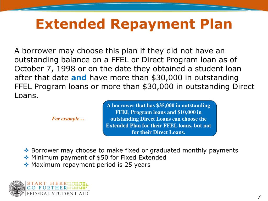 Extended Repayment Plan A borrower may choose this plan if they did not have an outstanding balance on a FFEL or Direct Program loan as of October 7, 1998 or on the date they obtained a student loan after that dateandhave more than $30,000 in outstanding FFEL Program loans or more than $30,000 in outstanding Direct Loans. A borrower that has $35,000 in outstanding FFEL Program loans and $10,000 in outstanding Direct Loans can choose the Extended Plan for their FFEL loans, but not for their Direct Loans. For example… • Borrower may choose to make fixed or graduated monthly payments • Minimum payment of $50 for Fixed Extended • Maximum repayment period is 25 years
