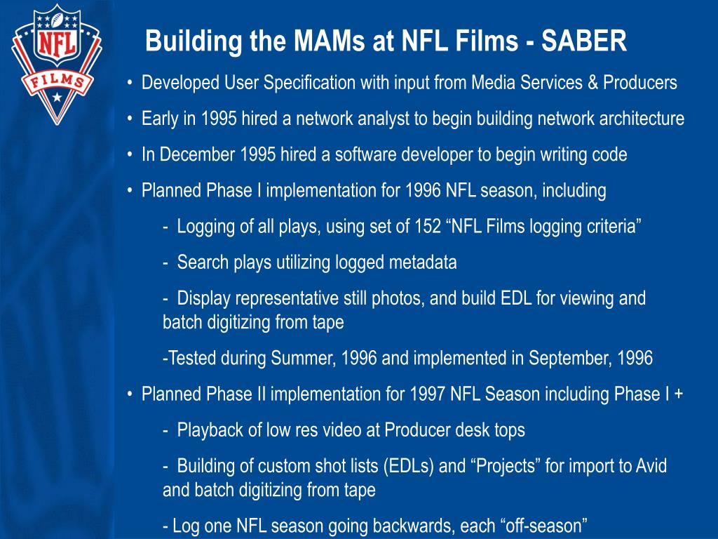 Building the MAMs at NFL Films - SABER • Developed User Specification with input from Media Services & Producers • Early in 1995 hired a network analyst to begin building network architecture • In December 1995 hired a software developer to begin writing code • Planned Phase I implementation for 1996 NFL season, including • - Logging of all plays, using set of 152 “NFL Films logging criteria” • - Search plays utilizing logged metadata • - Display representative still photos, and build EDL for viewing and batch digitizing from tape • Tested during Summer, 1996 and implemented in September, 1996 • Planned Phase II implementation for 1997 NFL Season including Phase I + • Playback of low res video at Producer desk tops • Building of custom shot lists (EDLs) and “Projects” for import to Avid and batch digitizing from tape • Log one NFL season going backwards, each “off-season”