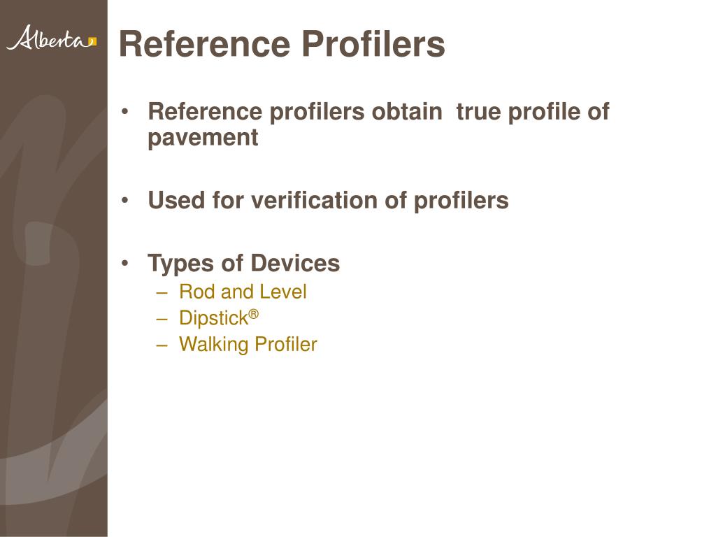 Reference Profilers • Reference profilers obtain true profile of pavement • Used for verification of profilers • Types of Devices • Rod and Level • Dipstick® • Walking Profiler