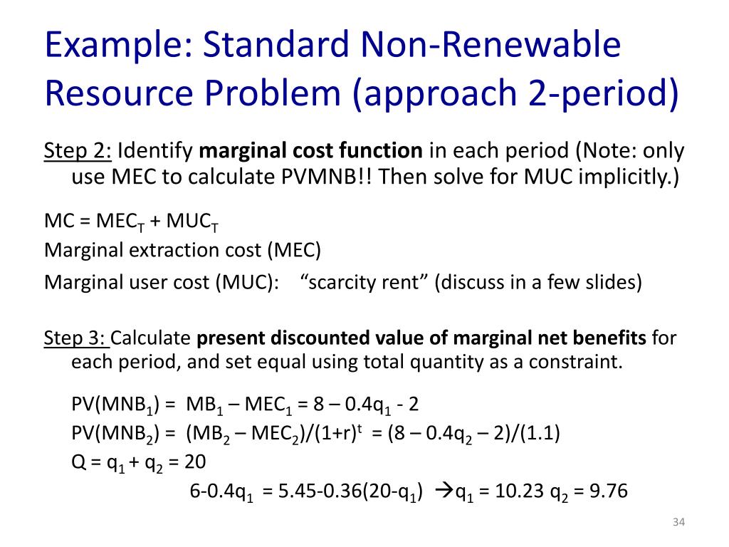 Example: Standard Non-Renewable Resource Problem (approach 2-period) Step 2: Identify marginal cost function in each period (Note: only use MEC to calculate PVMNB!! Then solve for MUC implicitly.) MC = MECT + MUCT Marginal extraction cost (MEC) Marginal user cost (MUC): “scarcity rent” (discuss in a few slides) Step 3: Calculate present discounted value of marginal net benefits for each period, and set equal using total quantity as a constraint. PV(MNB1) = MB1 – MEC1 = 8 – 0.4q1 - 2 PV(MNB2) = (MB2 – MEC2)/(1+r)t = (8 – 0.4q2 – 2)/(1.1) Q = q1 + q2 = 20 6-0.4q1 = 5.45-0.36(20-q1) q1 = 10.23 q2 = 9.76