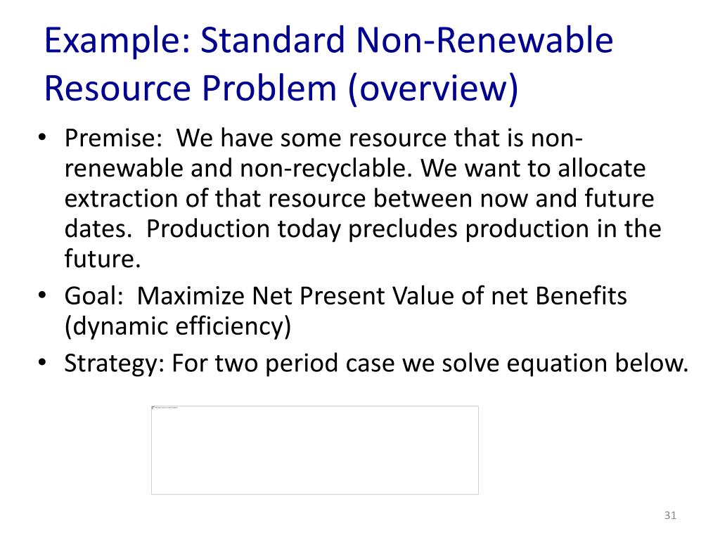 Example: Standard Non-Renewable Resource Problem (overview) • Premise: We have some resource that is non-renewable and non-recyclable. We want to allocate extraction of that resource between now and future dates. Production today precludes production in the future. • Goal: Maximize Net Present Value of net Benefits (dynamic efficiency) • Strategy: For two period case we solve equation below.