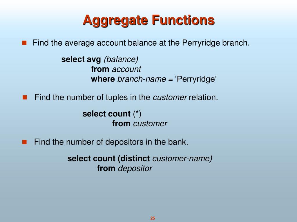 Aggregate Functions • Find the average account balance at the Perryridge branch. select avg (balance)from accountwhere branch-name = ‘Perryridge’ • Find the number of tuples in the customer relation. select count (*)from customer • Find the number of depositors in the bank. select count (distinct customer-name)from depositor