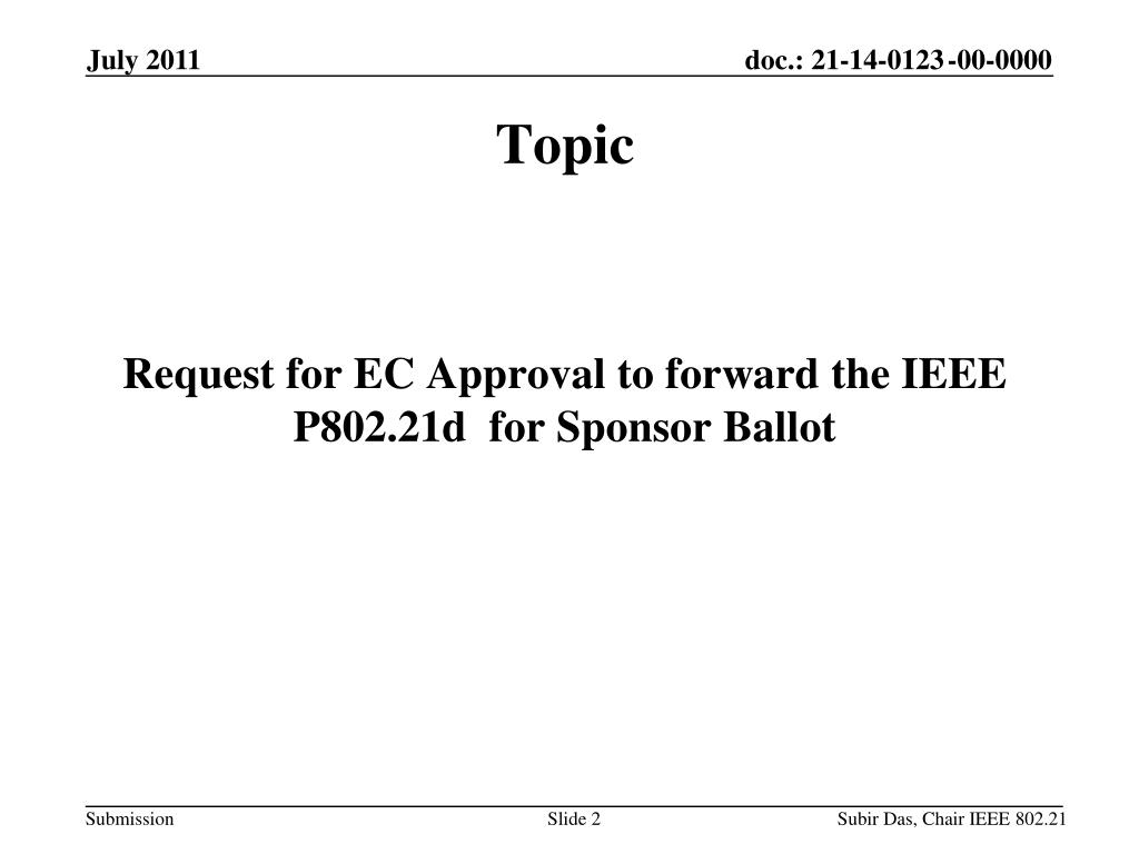 Topic Request for EC Approval to forward the IEEE P802.21d for Sponsor Ballot Slide 2 Subir Das, Chair IEEE 802.21