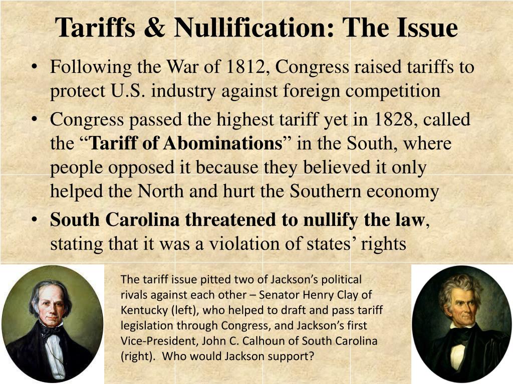 Tariffs & Nullification: The Issue • Following the War of 1812, Congress raised tariffs to protect U.S. industry against foreign competition • Congress passed the highest tariff yet in 1828, called the “Tariff of Abominations” in the South, where people opposed it because they believed it only helped the North and hurt the Southern economy • South Carolina threatened to nullifythe law, stating that it was a violation of states’ rights The tariff issue pitted two of Jackson’s political rivals against each other – Senator Henry Clay of Kentucky (left), who helped to draft and pass tariff legislation through Congress, and Jackson’s first Vice-President, John C. Calhoun of South Carolina (right). Who would Jackson support?