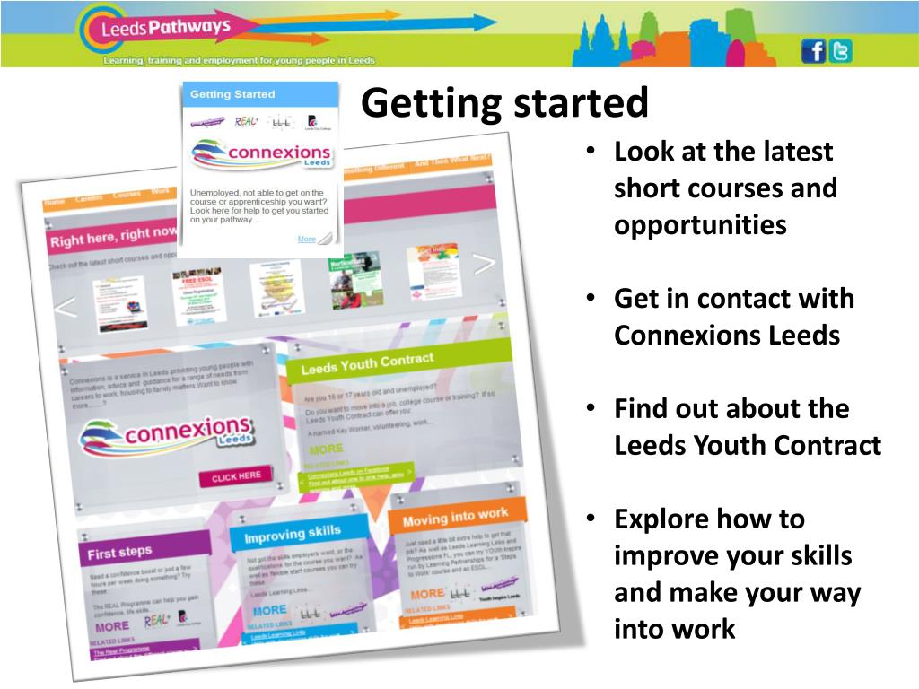 Getting started • Look at the latest short courses and opportunities • Get in contact with Connexions Leeds • Find out about the Leeds Youth Contract • Explore how to improve your skills and make your way into work