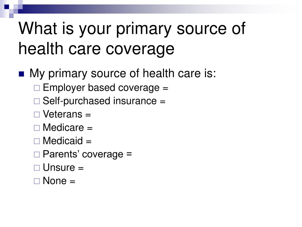 What is your primary source of health care coverage • My primary source of health care is: • Employer based coverage = • Self-purchased insurance = • Veterans = • Medicare = • Medicaid = • Parents’ coverage = • Unsure = • None =