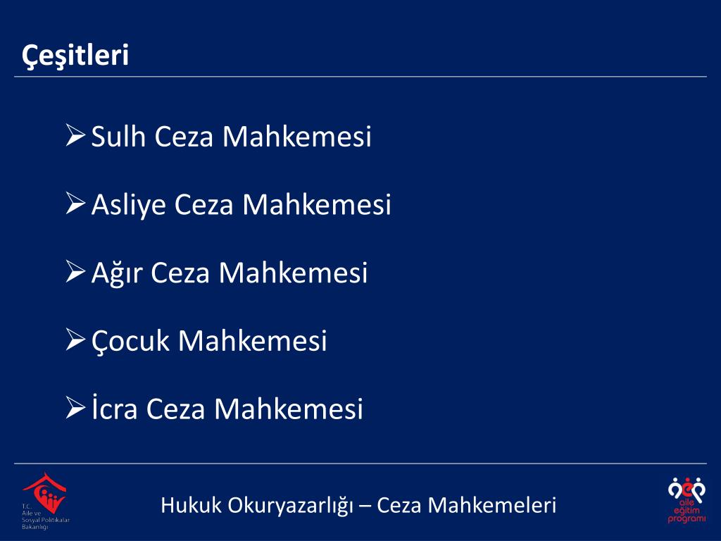 Çeşitleri • Sulh Ceza Mahkemesi • Asliye Ceza Mahkemesi • Ağır Ceza Mahkemesi • Çocuk Mahkemesi • İcra Ceza Mahkemesi Hukuk Okuryazarlığı – Ceza Mahkemeleri