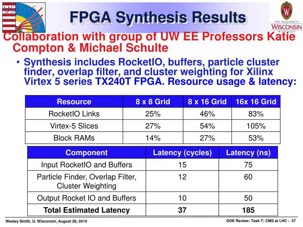 FPGA Synthesis Results • Collaboration with group of UW EE Professors Katie Compton & Michael Schulte • Synthesis includes RocketIO, buffers, particle cluster finder, overlap filter, and cluster weighting for Xilinx Virtex 5 series TX240T FPGA. Resource usage & latency: