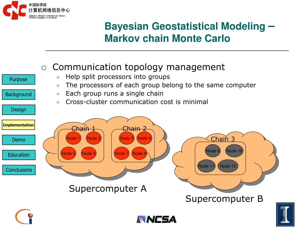 Bayesian Geostatistical Modeling –Markov chain Monte Carlo • Communication topology management • Help split processors into groups • The processors of each group belong to the same computer • Each group runs a single chain • Cross-cluster communication cost is minimal Purpose Background Design Implementation Chain 1 Chain 2 Node 1 Node 2 Node 5 Node 6 Chain 3 Demo Node 9 Node 10 Node 3 Node 4 Node 7 Node 8 Education Node 11 Node 12 Conclusions Supercomputer A Supercomputer B