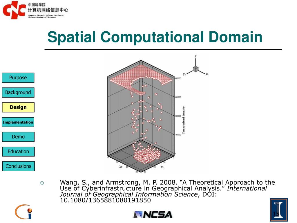 Spatial Computational Domain • Wang, S., and Armstrong, M. P. 2008. “A Theoretical Approach to the Use of Cyberinfrastructure in Geographical Analysis.”International Journal of Geographical Information Science, DOI: 10.1080/1365881080191850 Purpose Background Design Implementation Demo Education Conclusions