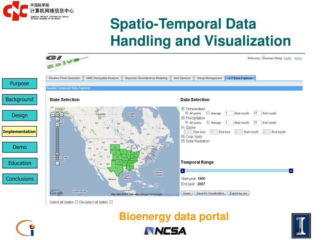 Spatio-Temporal Data Handling and Visualization Purpose Background Design Implementation Demo Education Conclusions Bioenergy data portal